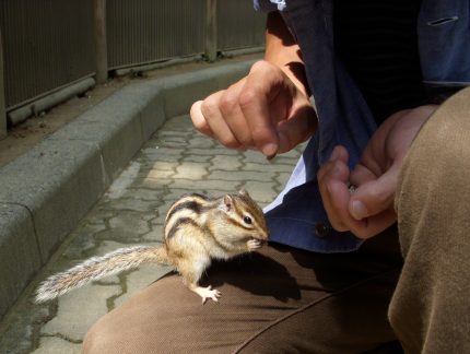 自由にリスが動き回っているので踏まないように気を付けてください(汗)とても人懐っこいので餌を求め膝にも上がってきます。