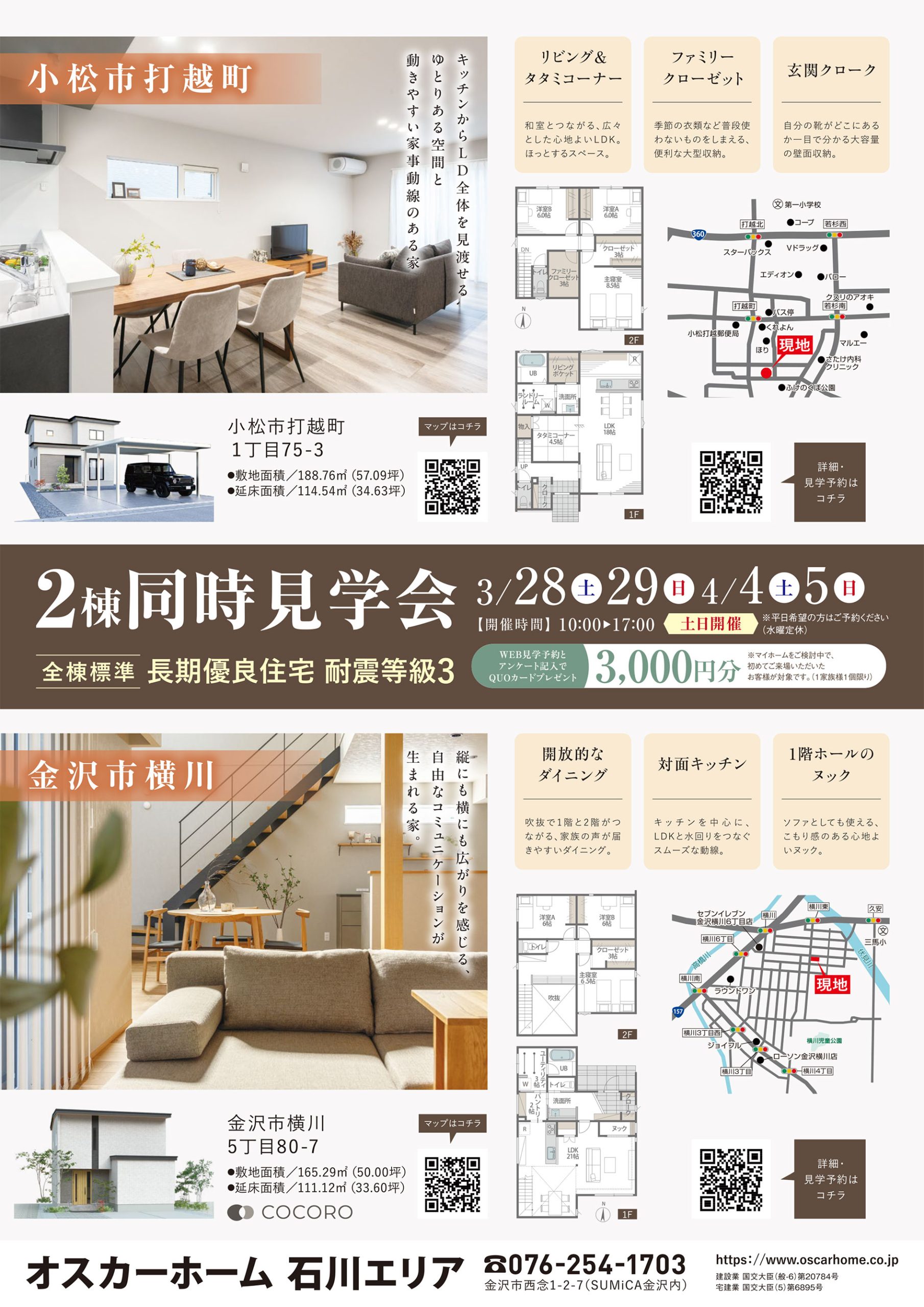 オスカーホームトップ > トピックス > モデルハウス見学会 > 【チラシ】小松市打越町・金沢市横川モデルハウス 見学会開催