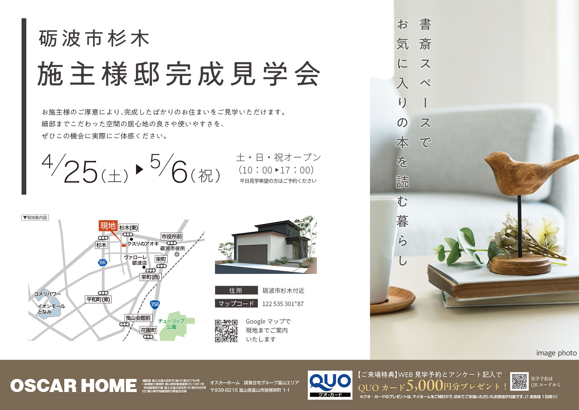 オスカーホームトップ > トピックス > 完成見学会 > 【チラシ】砺波市杉木 施主様邸 見学会開催