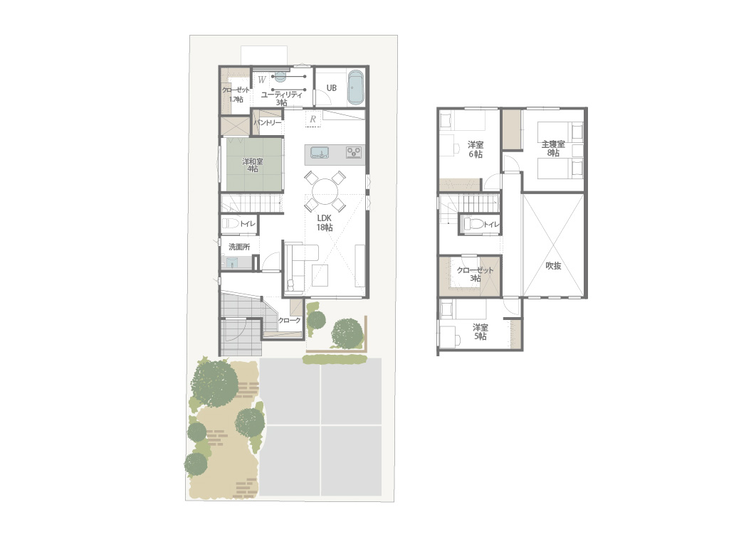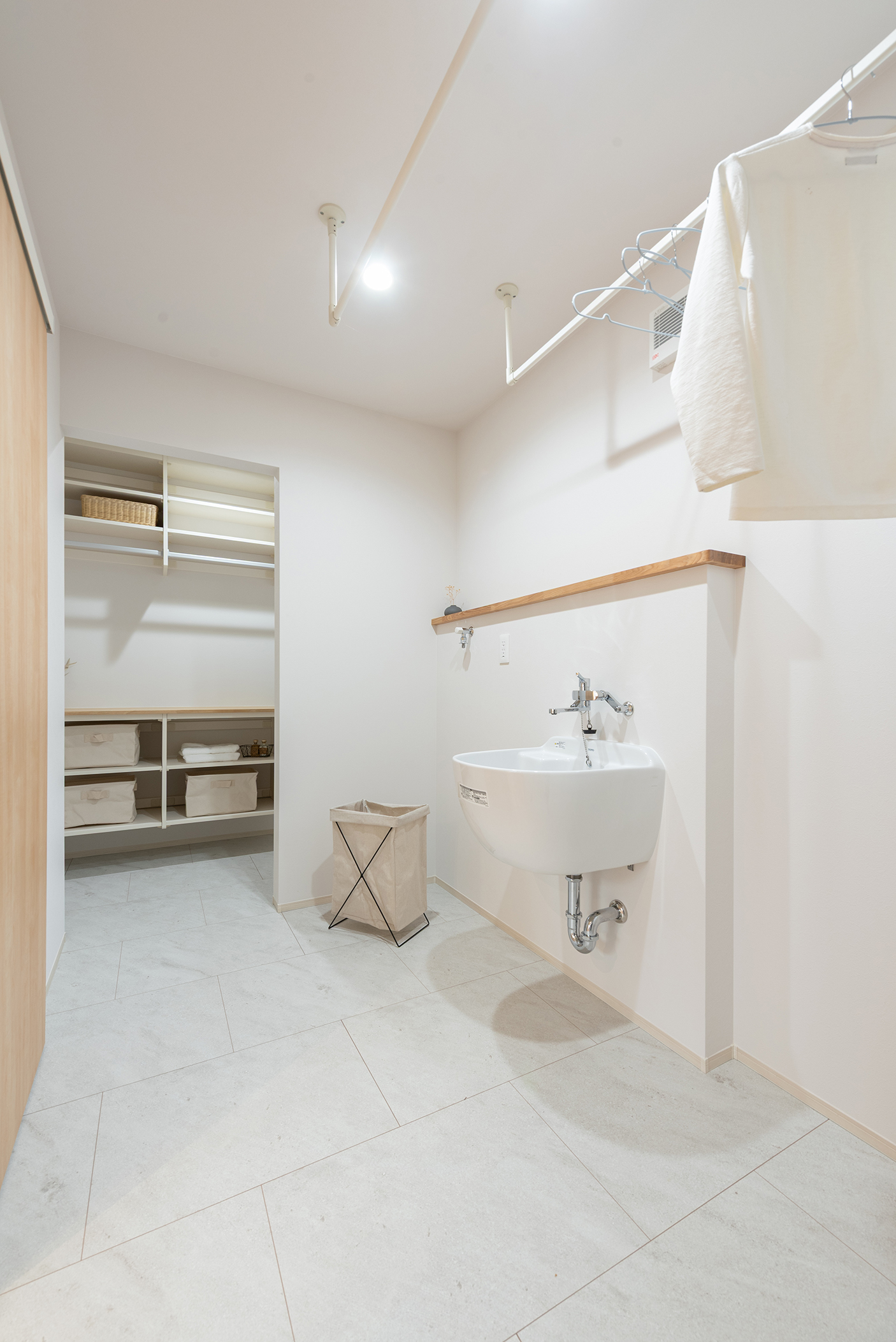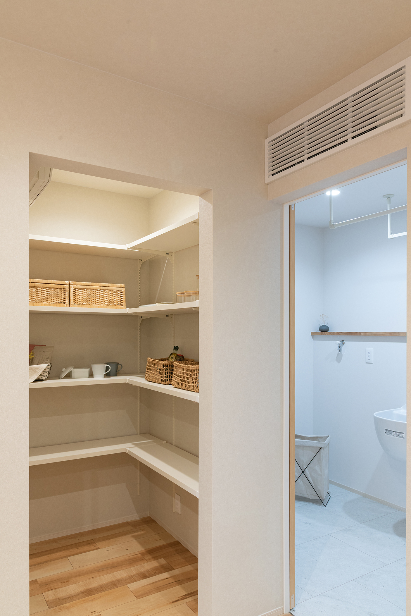 【豊富な収納スペース】 スリッパでも行き来できる床あり玄関クロークや、必要な物をすぐに出し入れしやすいパントリーなど各所の豊富な収納で家中すっきり片付けやすいです。
