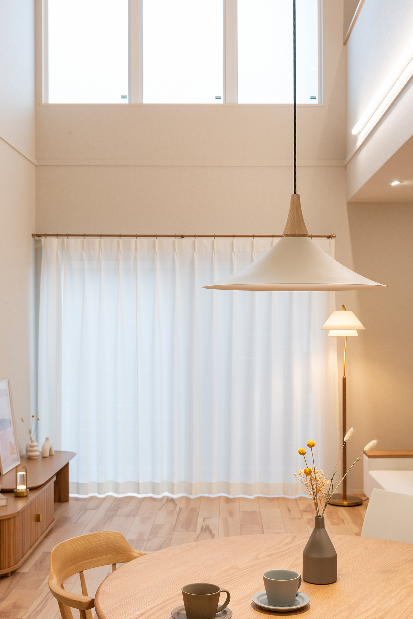 【明るく開放的なLDK】 吹抜けから差し込む自然光がLDK全体をより開放的な空間に演出します。1・2階の一体感が心地よく、コミュニケーションも取りやすいです。