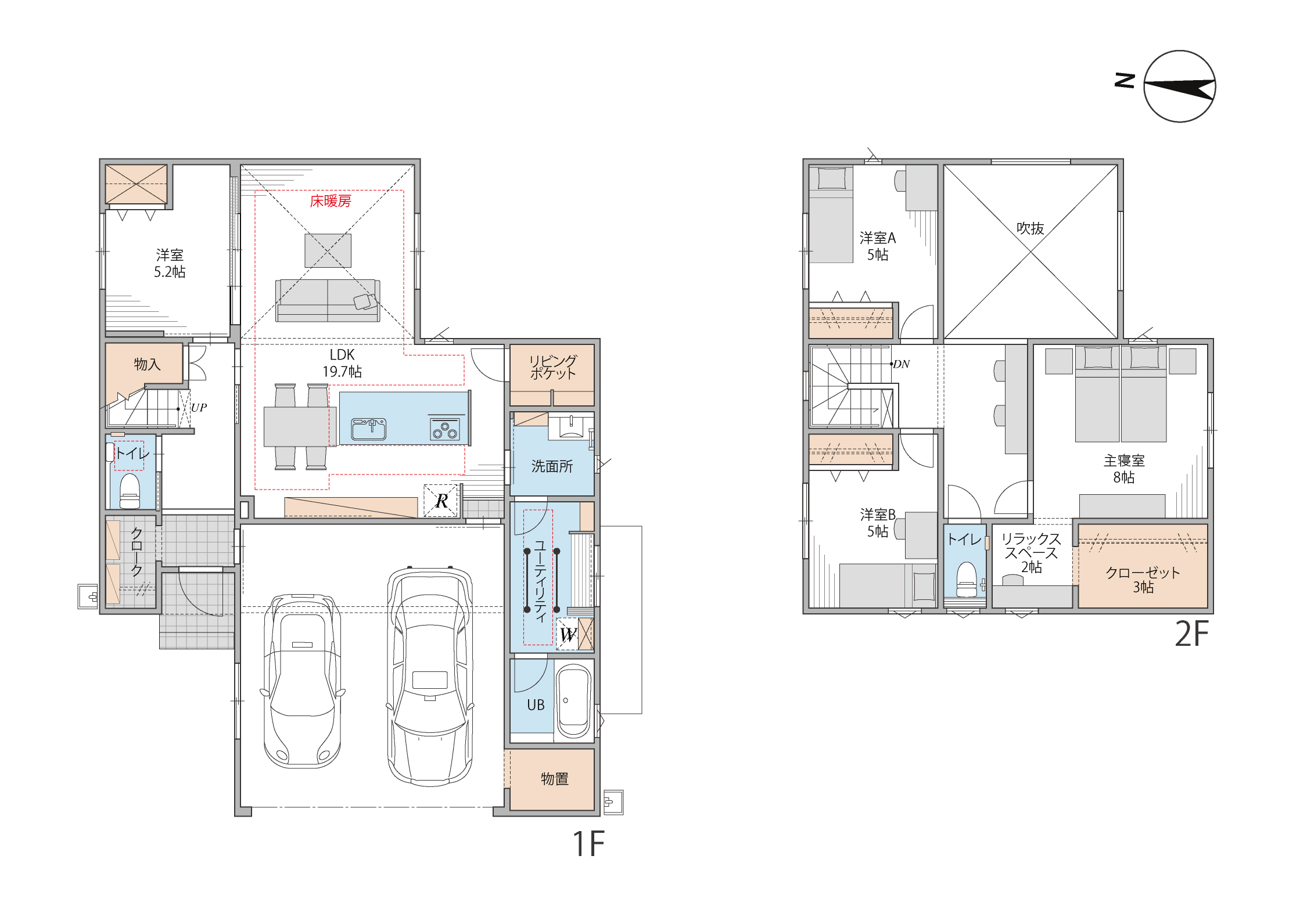 ❶ 外を通らずに室内へ出入りできる、北陸の冬には欠かせない便利なインナーガレージ。 ❷ 大きな吹抜けのあるLDKと洋和室を繋げて使えば、さらにゆとりの空間に。 ❸ LDKの広範囲に施行された床暖房。北陸の寒い冬も足元から暖かく快適に過ごせます。 ❹ リビングポケットや玄関クローク、ガレージ内の物置など各所の充実した収納で家中片付けやすく◎
