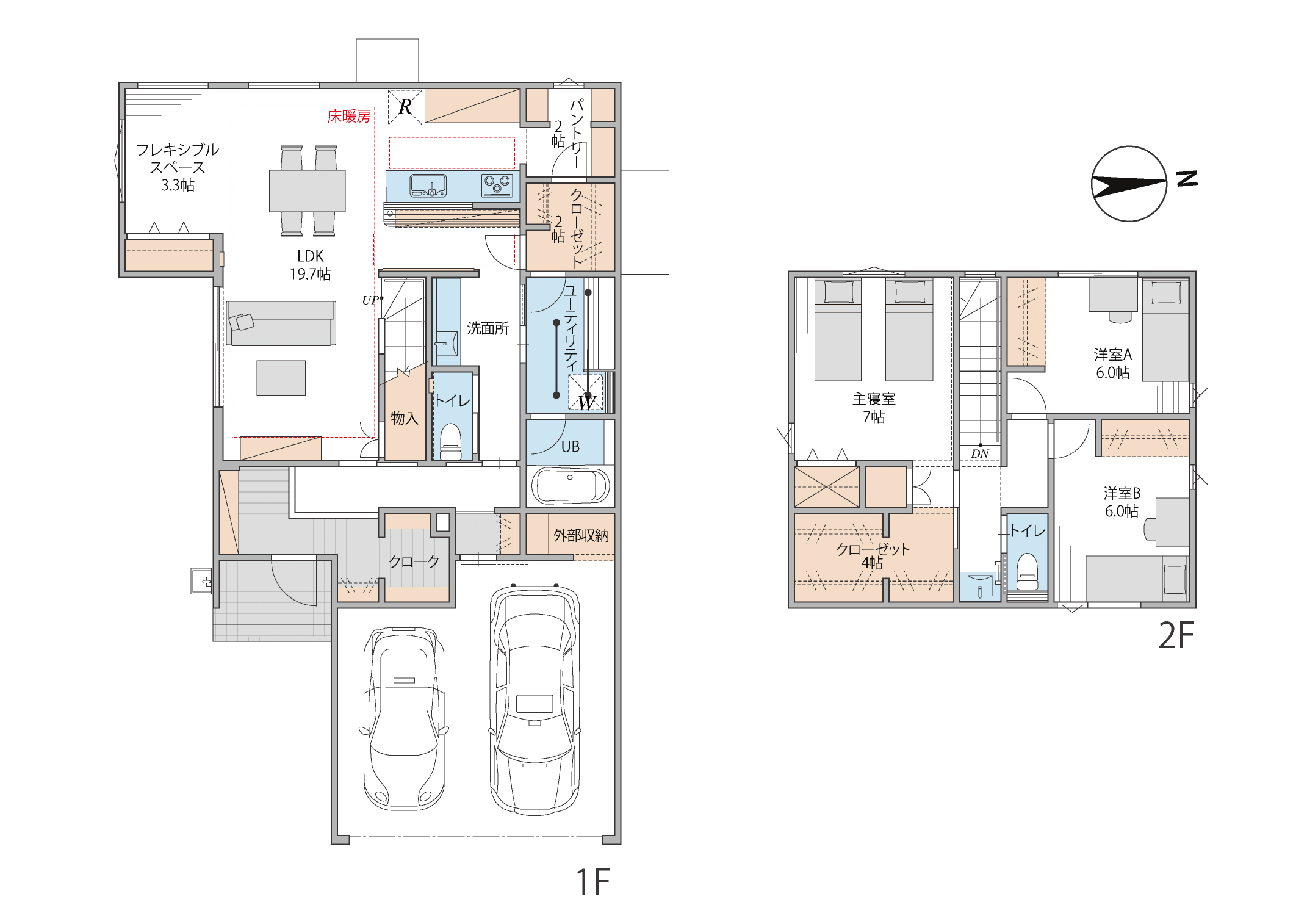 ❶ 外を通らずに室内へ出入りできる、北陸の冬には欠かせない便利なインナーガレージ。 ❷ LDKとフレキシブルスペースを併せて使えるゆとりのある快適な空間。 ❸ LDKの広範囲に施行された床暖房。北陸の寒い冬も足元から暖かく快適に過ごせます。 ❹ 収納と水廻りを一列で配置することで家事ラクに◎各所に配置された豊富な収納で片付けもしやすく。