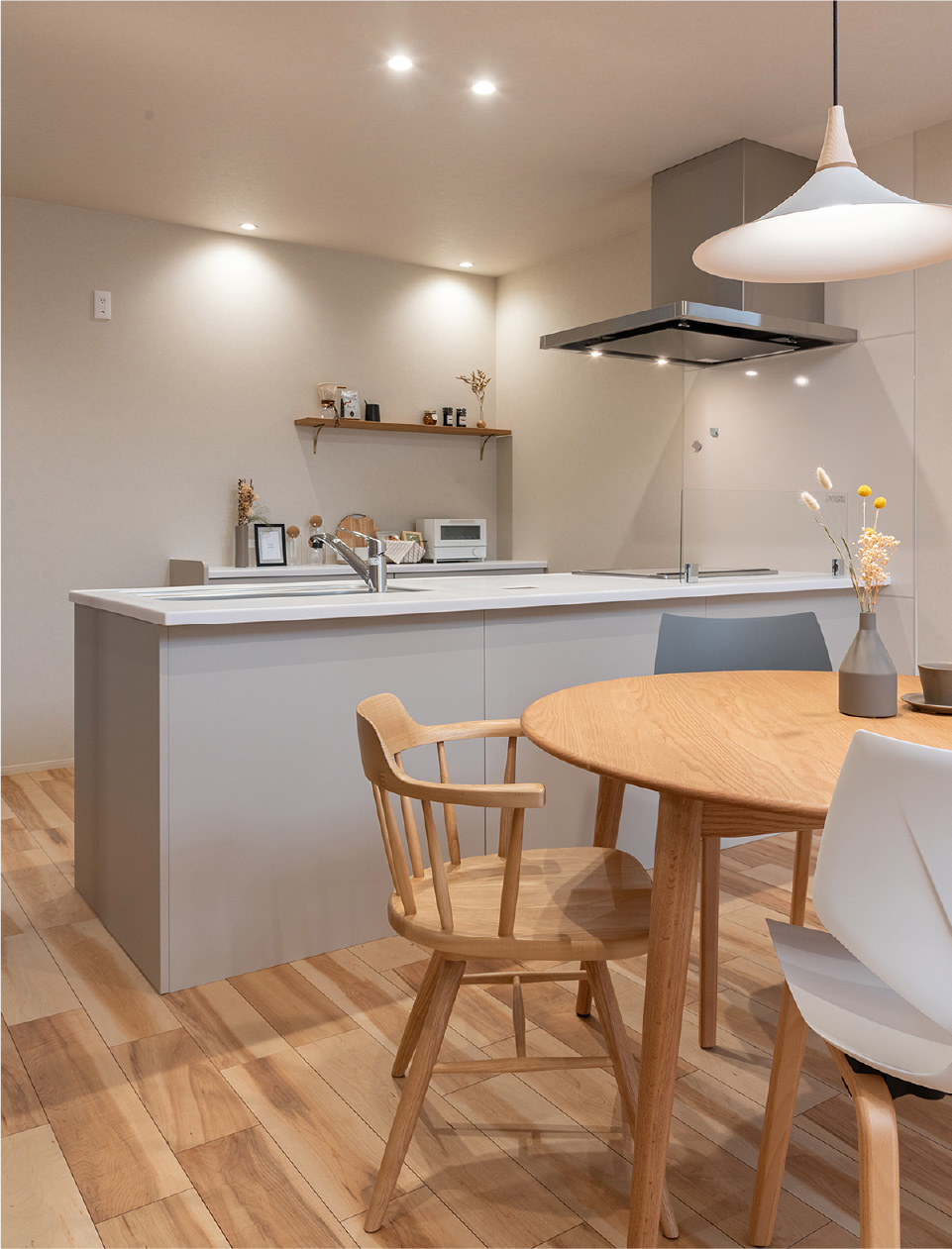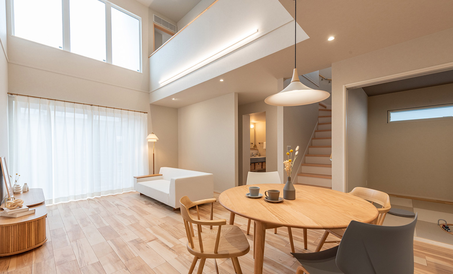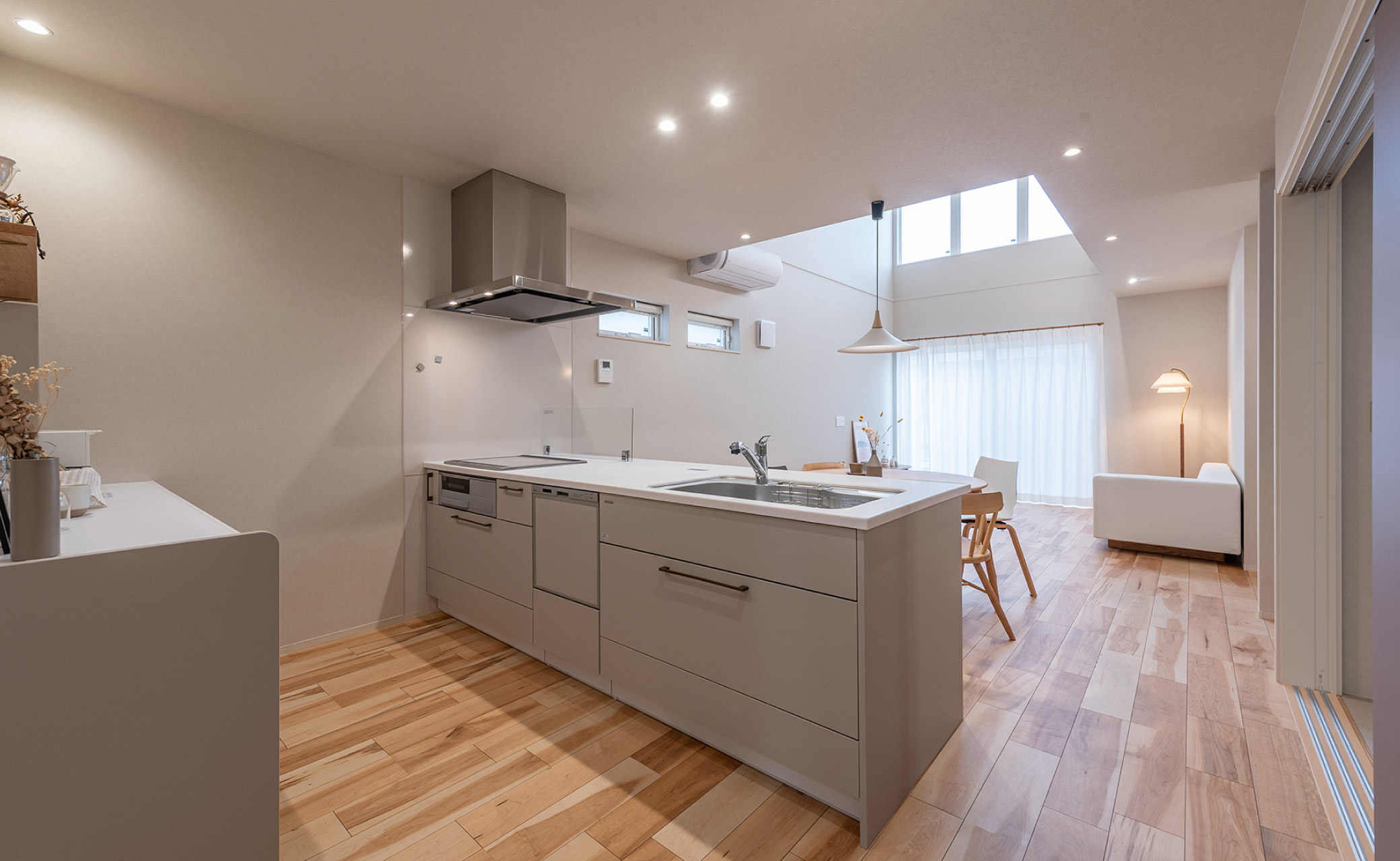 窓からの光があふれるLDKは、キッチンまでやさしい光が届きます。さらに、吹抜けを通して家族の気配が伝わるつくりにもなっているため、毎日の時間を気持ちよく過ごせます。 また、⼦育て世代にうれしい適材適所の収納や設備も充実しています。
