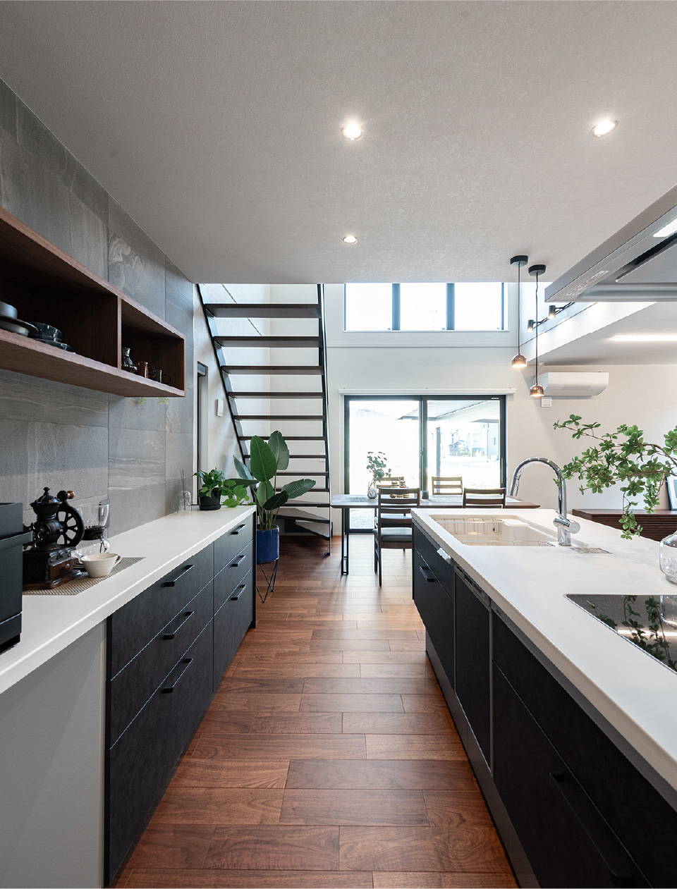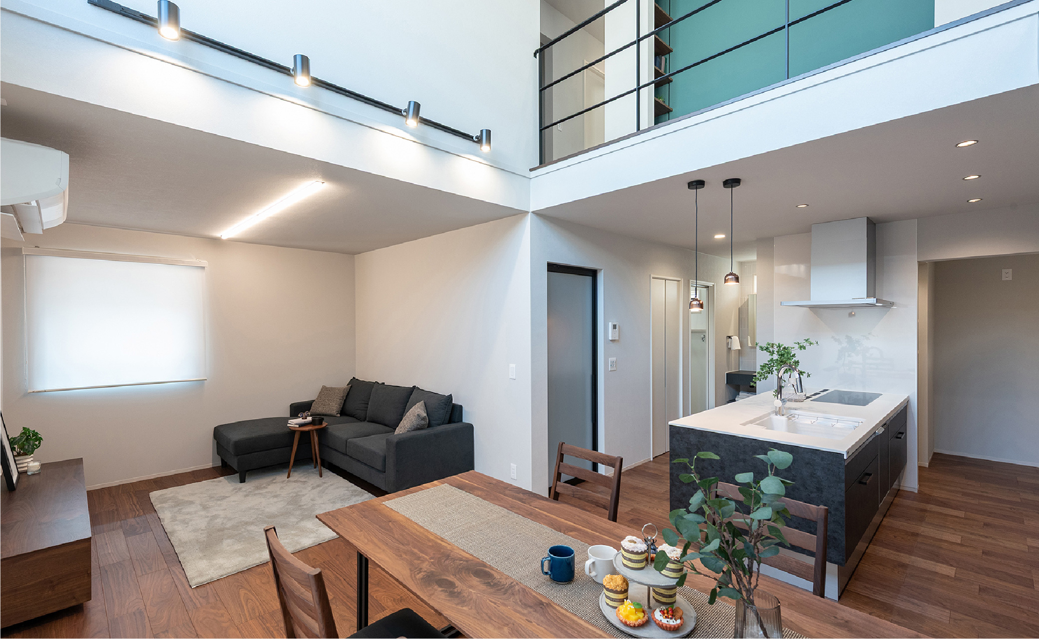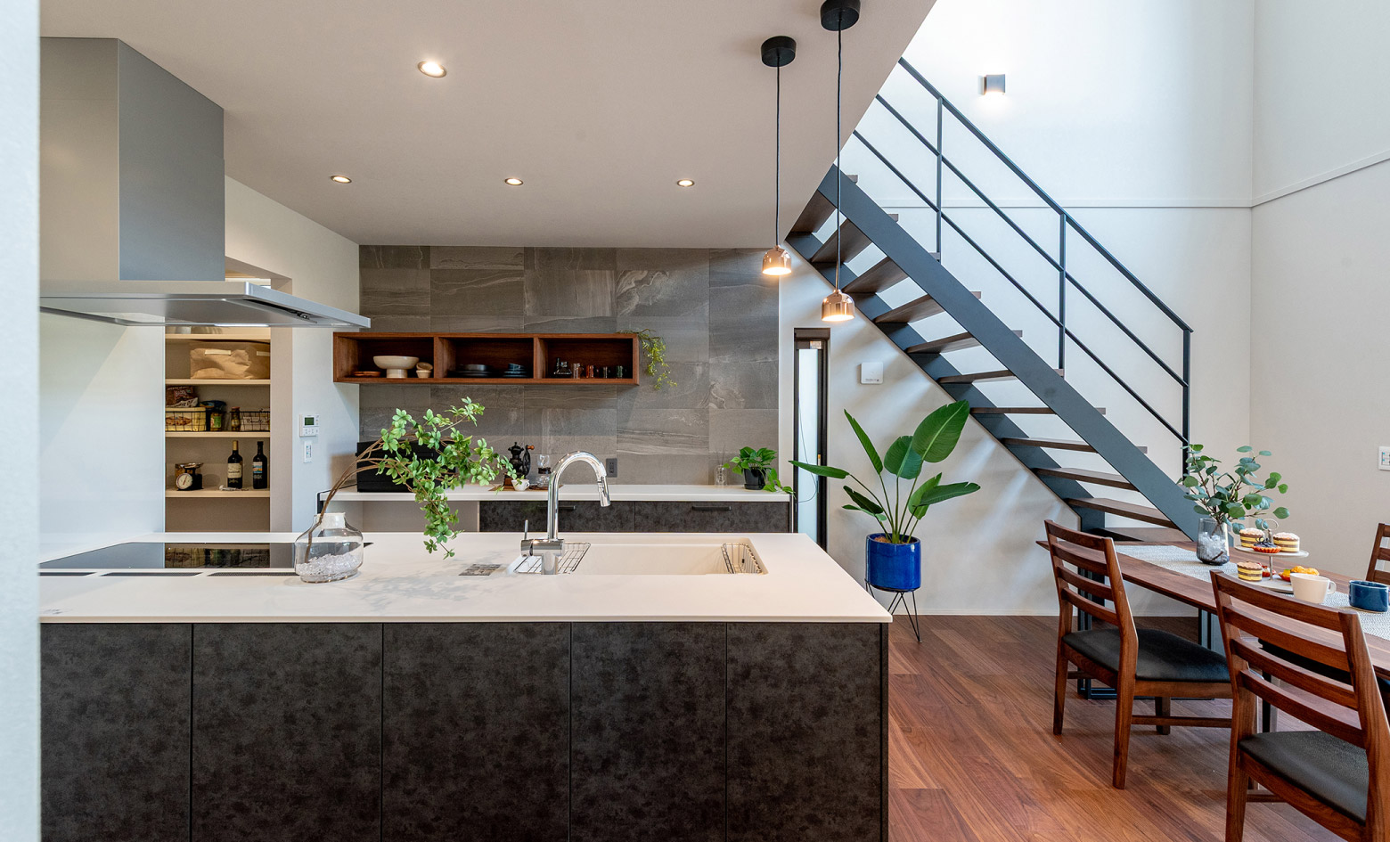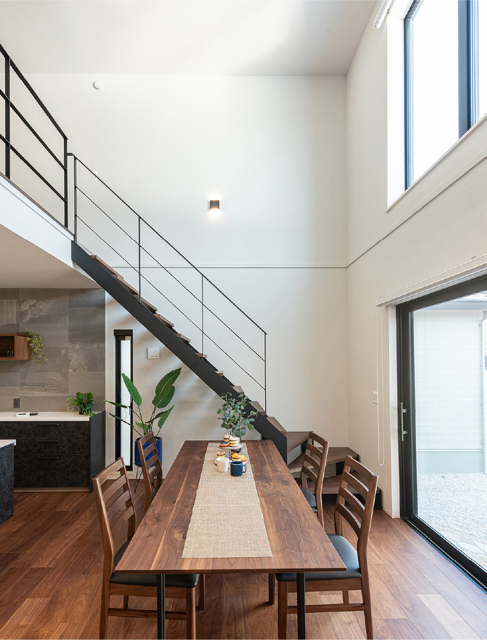 休日の穏やかな時間から友人たちとのホームパーティまで、吹抜けのダイニングを中心に、どこからでも庭の気配を感じられる空間が、日々の暮らしを豊かに彩ります。
