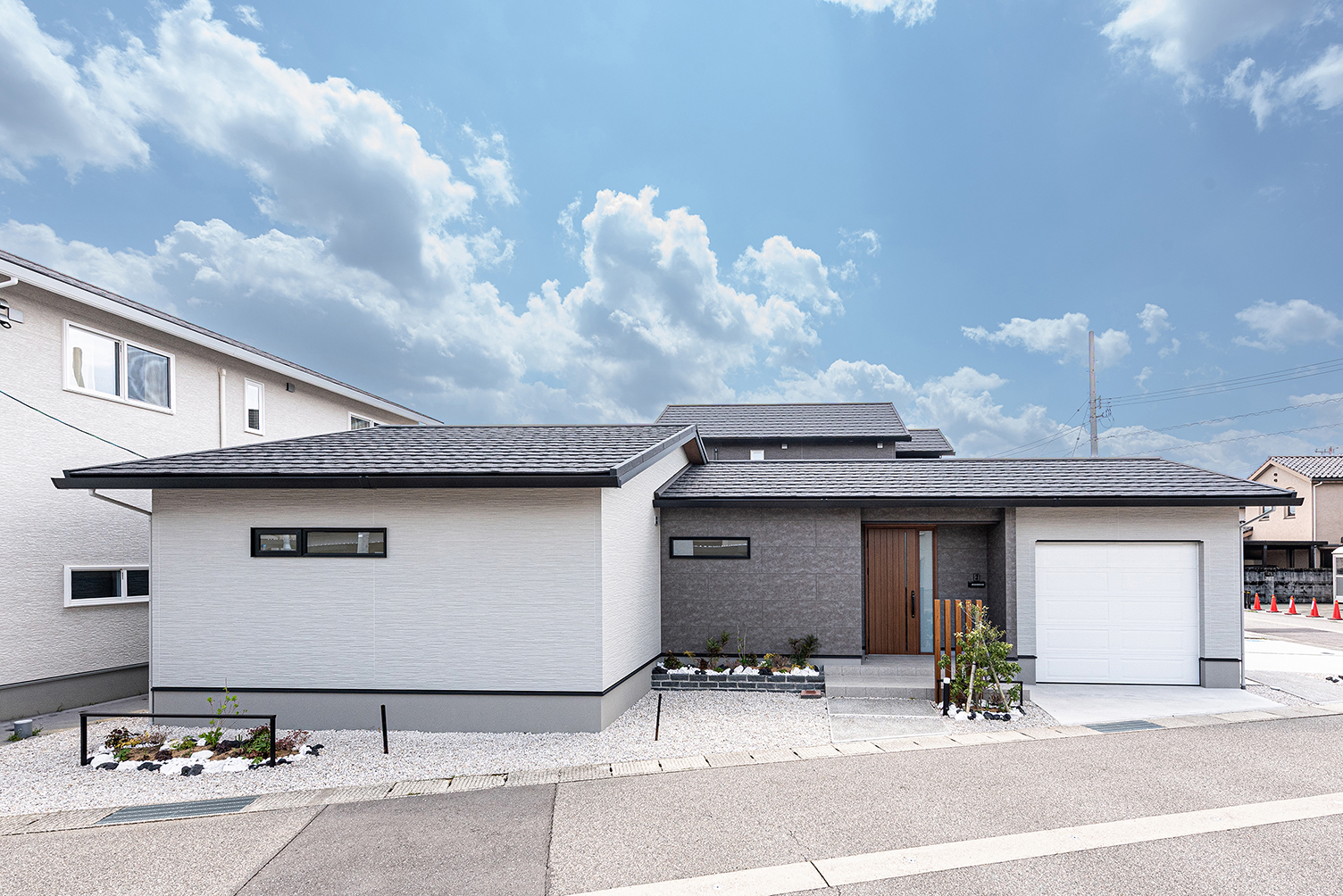 フラットな切り妻屋根が印象的な平屋の住まい。清潔感のあるグレーと白のコントラストが美しいスタイリッシュな和モダンの住まい。