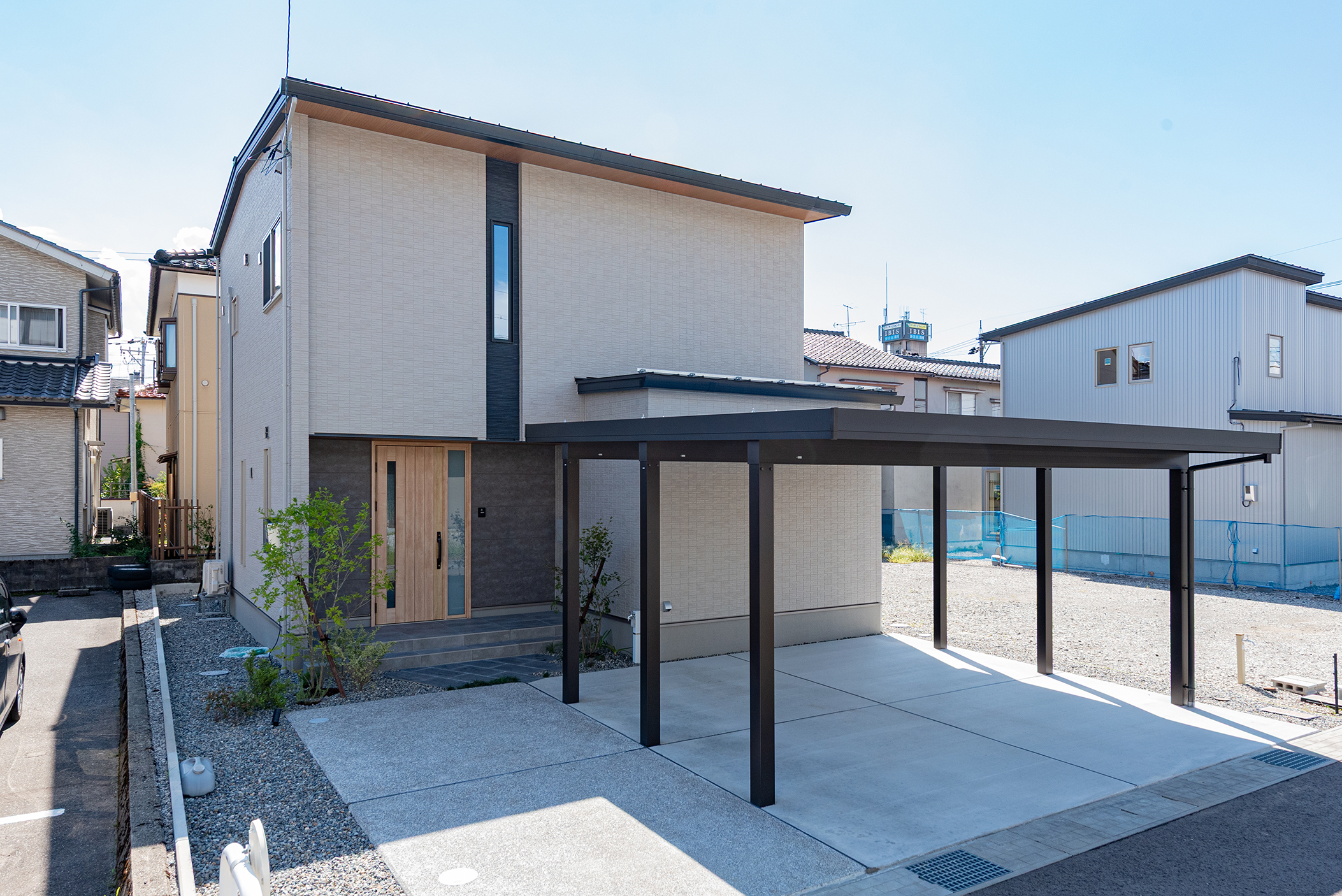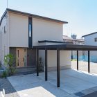 木質感のある収納とグレーのタイルのコントラストが美しい玄関。大きなガラスのドアが調和し、空間全体をスタイリッシュな印象に。